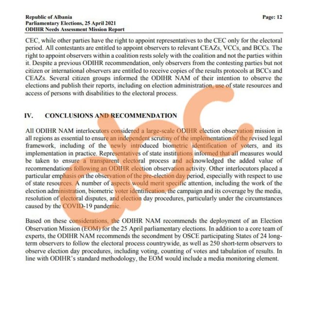 Në dokumentin e publikuar nga ODIHR evidentohet shqetësimi i ngritur nga opozita për vëzhgimin e periudhës parazgjedhore por edhe përdorimin e burimeve shtetërore.