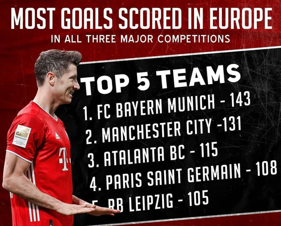 Bavarezët numërojnë 143 rrjeta të tundura, 12 më shumë se “Qytetarët” e drejtuar nga Pep Guardiola. Në podium është Atalanta, që ka shënuar 115 gola këtë sezon. Një shifër rekord për skuadrën italiane, që jo më kot është kualifikuar në çerekfinalet e Champions League.