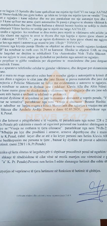 Në dosje citohet: “Në vendin e ngjarjes ka rezultuar se disa metra para mjetit të viktimave mbi asfalt janë gjetur xhama me ngjyrë të errët të thyera dhe nga këqyrja e njërës pjesë të xhamit janë shkronjat ‘TOYO…”. Pra që ngrenë dyshimin se këto pjesë xhami me ngjyrë janë lënë nga mjeti i autorëve që mund të jetë i mjetit “TOYOTA”. Nga këqyrja e pamjeve filmike ka rezultuar se rreth orës 16:35 në kamerat filmike në rrugë largohen në drejtim të mbikalimit te Nishtulla në Shkozet një atomjet me ngjyrë të zezë që dyshohet në përdorim nga autorët”
