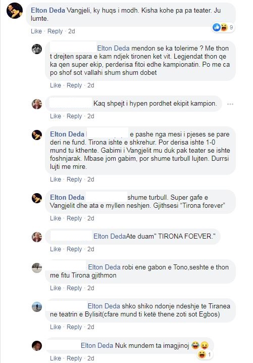 Ajo që i ka lënë shije të hidhur Dedës është gabimi i mbrojtësit Kristi Vangjeli. Korçari gaboi te goli i dytë i Teutës, shënuar nga Lorenco Vila, dhe këngëtari shkruan në faqen e Tiranës se ju duk teatër ajo që ndodhi.