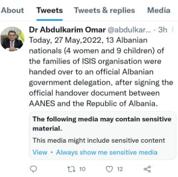“On May 27, 2022, 13 Albanian citizens (4 women and 9 children) of ISIS families were handed over to an official delegation of the Albanian government, after the signing of the official handover document between AANES and the Republic of Albania”, wrote a senior Syrian official Dr. Abdulkarim Omar”.