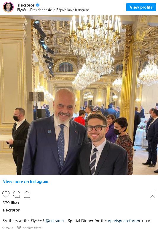 “Vëllezërit në Elysee. Një darkë speciale në Forumin e Paqes”, shkruan Alex Soros, bashkëngjitur fotos ku shfaqet krah kryeministrit Rama.