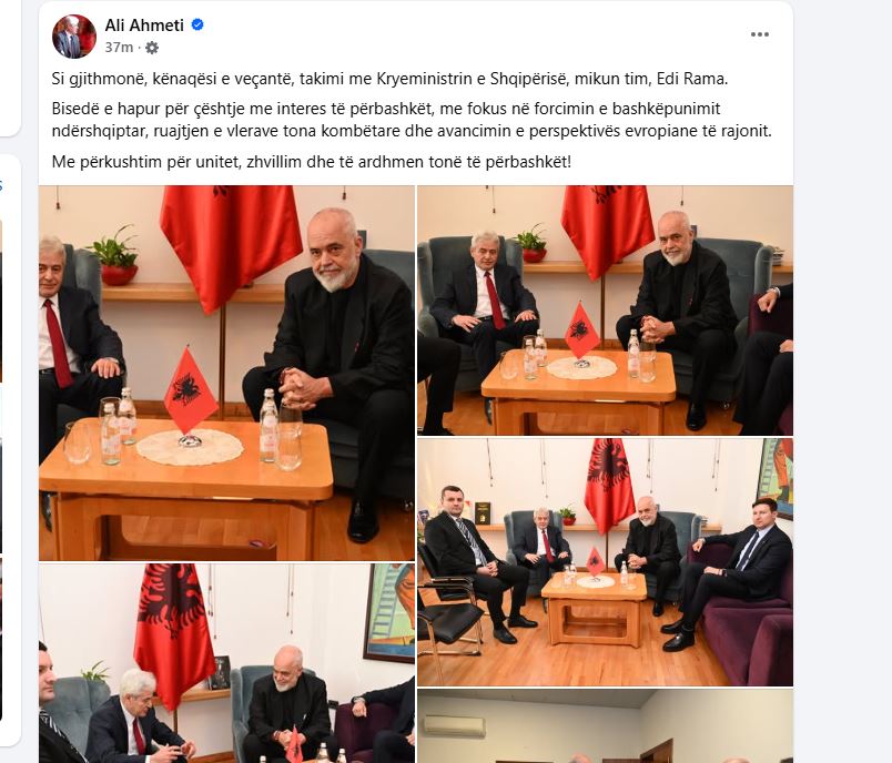 Ali Ahmeti është takuar me kryeministrin Edi Rama. Nëpërmjet një statusi në Facebook, Ahmeti thotë se ka pasur ‘bisedë të hapur për çështje me interes të përbashkët’’.
