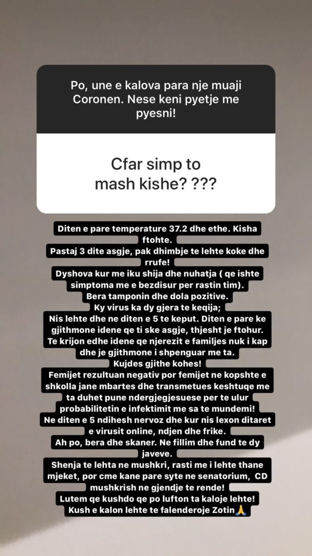“Ditën e parë kisha temperaturë 37.2 dhe ethe. Kisha ftohtë. Pastaj 3 ditë asgjë, pak dhimbje të lehtë koke dhe rrufë. Dyshova kur më iku shija dhe nuhatja (që ishte simptoma më e bezdisur për rastin tim.) Bëra tamponin dhe dola pozitive. Ky virus ka dy gjëra të këqija: Nis lehtë dhe në ditën e 5 të këput. Ditën e parë ke gjithmonë idenë që nuk ke asgjë, thjesht je ftohur.