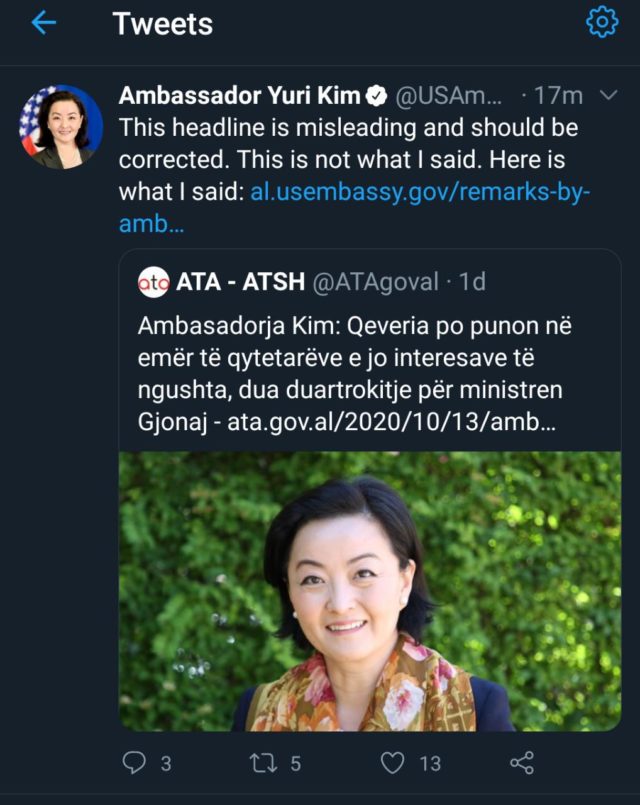 Ambasadorja amerikane në Tiranë Yuri Kim ka përgënjeshtruar përmes një postimi në faqen e saj në Twitter, një lajm të Agjencisë Telegrafike Shqiptare, duke e cilësuar si çorientues dhe të pavërtetë.