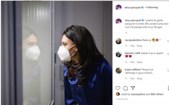 Elisa shfaqet ndryshe nga kostumi i politikës me të cilën jemi mësuar ta shohim, pasi me këtë foto vjen më artistike , ndërsa e ka shoqëruar me një shprehje të autorit të njohur spanjoll Jorge Luiz Borges që thotë: “I pashë të gjitha pasqyrat e botës dhe asnjëra prej tyre nuk më pasqyron mua.”
