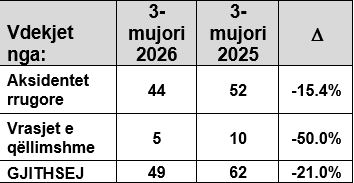 (Në tremujorin e parë 2026, 20.1% më pak vdekje rrugore dhe nga krimi)