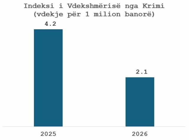Vdekshmëria nga krimi është përgjysmuar, krahasuar me 2025. Shihni grafikun e mëposhtëm për indeksin e vdekshmërisë nga krimi (vdekje nga krimi për 1 milion banorë).