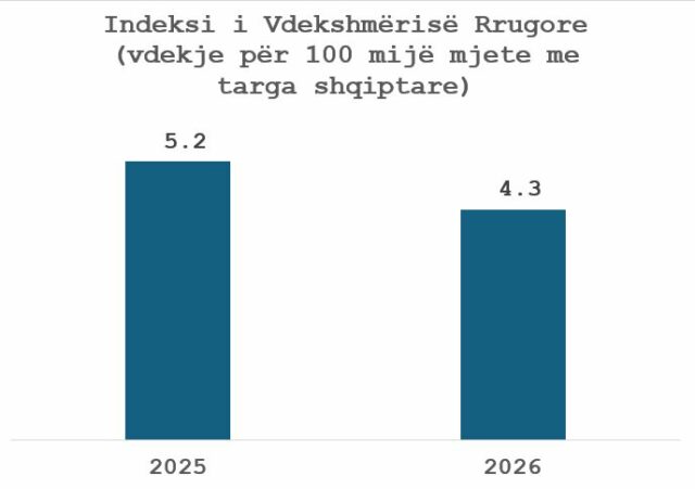 Po të llogarisim indeksin e vdekshmërisë rrugore (vdekje rrugore për 100 mijë automjete me targa shqiptare), rezulton se vdekshmëria rrugore është ulur me pothuaj 1/5 brenda një viti (shihni grafikun e mëposhtëm).