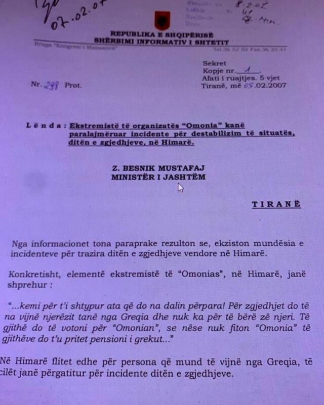 Në atë kohë, Sali Berisha ishte kryeministër dhe kjo letër i mbërrinte qeverisë së tij për t’i treguar se veprimtaria e Fredi Belerit kishte filluar të bëhej shqetësuese. Element ekstremist që mund nxisë trazira, në prag të zgjedhjeve lokale, i thoshte SHISH ministrit të jashtëm të kohës, Besnik Mustafaj.