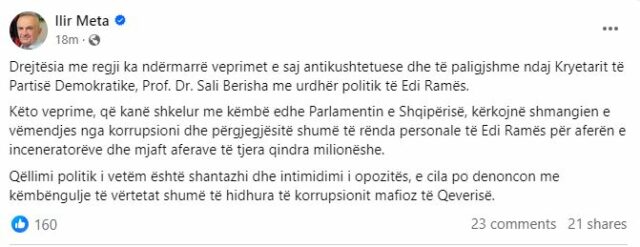“Qëllimi politik i vetëm është shantazhi dhe intimidimi i opozitës, e cila po denoncon me këmbëngulje të vërtetat shumë të hidhura të korrupsionit mafioz të Qeverisë.”, shkruan Meta.