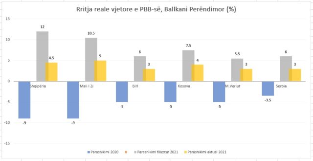 Sipas “Perspektivës Ekonomike Globale në rajonet e BERZH”, të sapo publikuar, ekonomia shqiptare, pas rënies me 9% në vitin 2020 pritet që të rritet me vetëm 4.5% në vitin 2021. Në raportin e muajit maj, ekonomia shqiptare parashikohej që do të rimëkëmbej me shpejtësi me 12% në 2021, ndërsa tashmë ky vlerësim është ulur me 7.5 pikë përqindje. Ky është rishikimi më i madh në ulje jo vetëm për vendet e Ballkanit, por për të gjithë rajonin e BERZH.