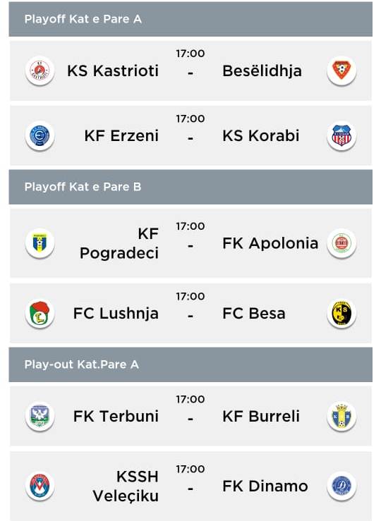 Jo vetëm Superiorja luhet sot. Në program janë edhe gjashtë përballje të Kategorisë së Parë dhe spikatin dy përballje mjaft interesante. Në Fushë-Krujë, Kastrioti pret Besëlidhjen e vendit të dytë dhe do kërkojë fitoren që i çon në Superiore. Krutanët do tentojnë t’i mbyllin sot llogaritë, kurse lezhjanët t’i mbajnë hapur.