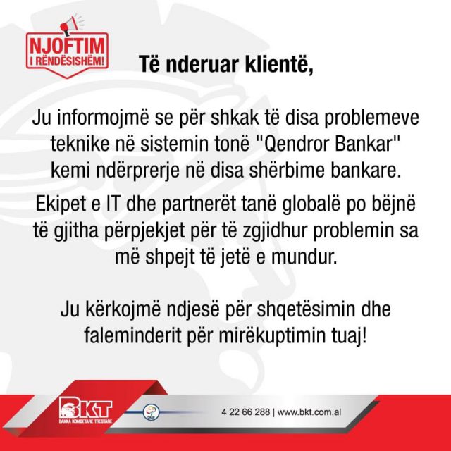 Problematika ka bërë që BKT të njoftojë klientët përmes një postimi në Facebook se për shkak të disa probleme teknike, nuk është në gjendje të ofrojë një pjesë të shërbimeve për klientët.