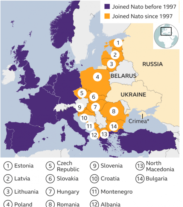 Presidenti Putin pretendon se fuqitë perëndimore po përdorin aleancën për të dobësuar Rusinë dhe dëshiron që NATO të pezullojë aktivitetet e saj ushtarake në Europën Lindore. Ai ka argumentuar prej kohësh se Shtetet e Bashkuara kanë shkelur garancinë e vitit 1990 se NATO nuk do të përfshinte vende të lindjes.