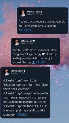 “Nuk është ‘trup’ me shku te psikologu. Nuk është ‘turp’ me fol për ankth e depresion! Nuk është ‘turp’ me qenë vetvetja dhe mos me ra në provokim të njerëzve të cilët nuk të respektojnë për atë që je! Nuk është ‘turp’ me thonë NUK DUA! Dhe m`u shpreh në qoftë se dikush t’ka keqpërdor”, shkruan ndër të tjera Dafina. /abcnews.al