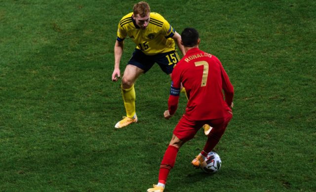 Kulusevski në një dyluftim me Ronaldon gjatë ndeshjes Suedi-Portugali