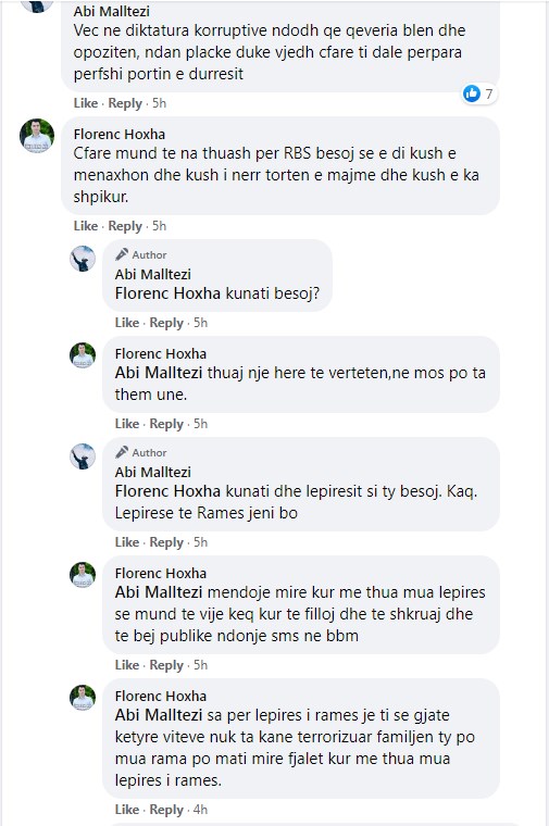 Florenc Hoxha: Mendoje mirë kur më thua mua lëpirës së mund të vijë keq kur të fillojë dhe të shkruaj dhe të bëj publike ndonjë sms në bbm. Sa për lëpires i Ramës je ti se gjatë këtyre viteve nuk ta kanë terrorizuar familjen ty po mua Rama, po mati mirë fjalët kur më thua mua lëpirës i Ramës. /abcnews.al/