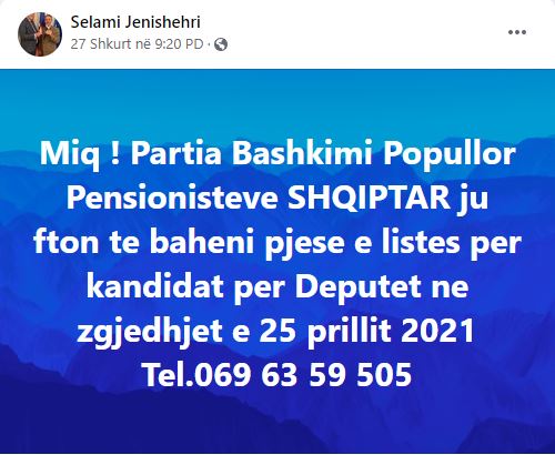 Deputeti Selami Jenishehri, kryetar i partisë Bashkimi Popullor i Pensionistëve Shqiptarë është përfshirë në një debat në Facebook me ndjekësit, teksa njërin prej tyre e ka kërcënuar me gjyq.