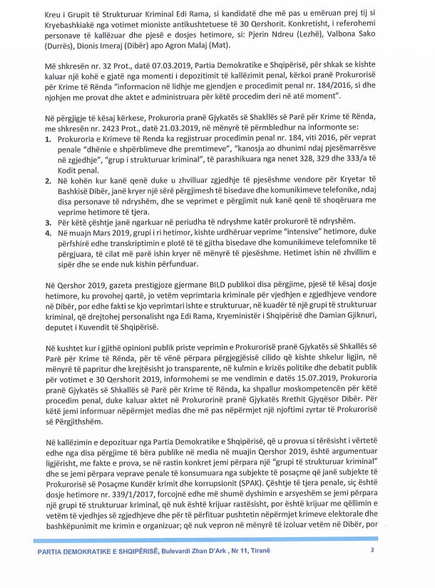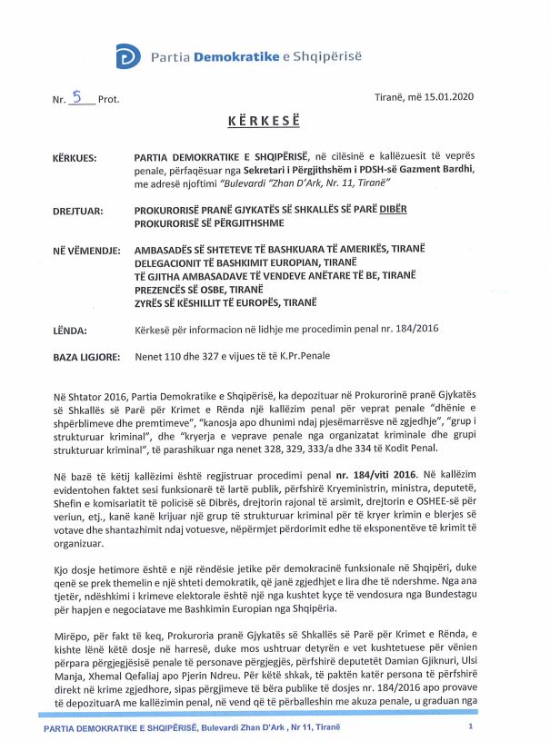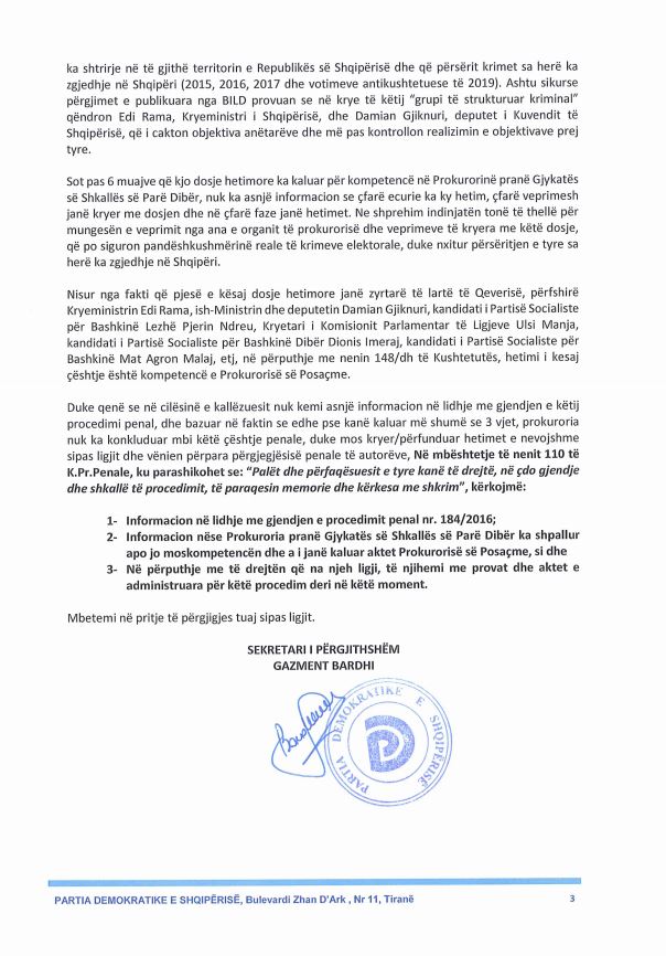 “Në Qershor 2019, gazeta gjermane  Bild, publikoi përgjime, pjesë të kësaj dosje hetimore, ku provohej qartë, jo vetëm veprimtaria kriminale për vjedhjen e zgjedhjeve vendore në Dibër, por edhe fakti se kjo veprimtari ishte e struktuar, në kuadër të një grupi të strukturuar kriminal, që drejtohej personalisht nga Edi Rama, Kryeministër i Shqipërisë dhe Damian Gjiknuri, deputet i Kuvendit të Shqipërisë”- thuhet në letrën e Sekretarit të Përgjithshëm të PD, Gazment Bardhi për Prokurorinë e Dibrës.