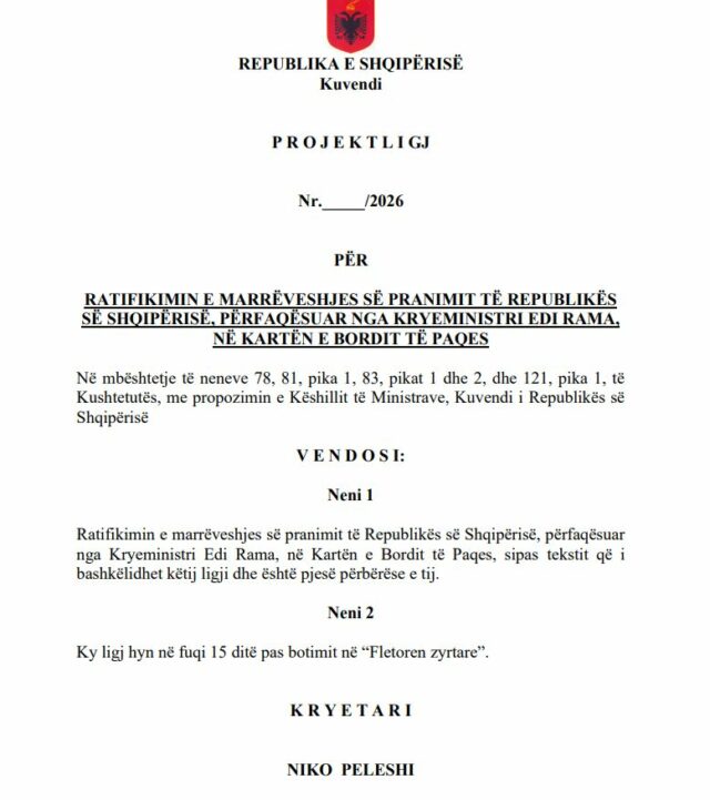Projektligji “për ratifikimin e marrëveshjes së pranimit të Republikës së Shqipërisë, përfaqësuar nga kryeministri Edi Rama, në Kartën e Bordit të Paqes”