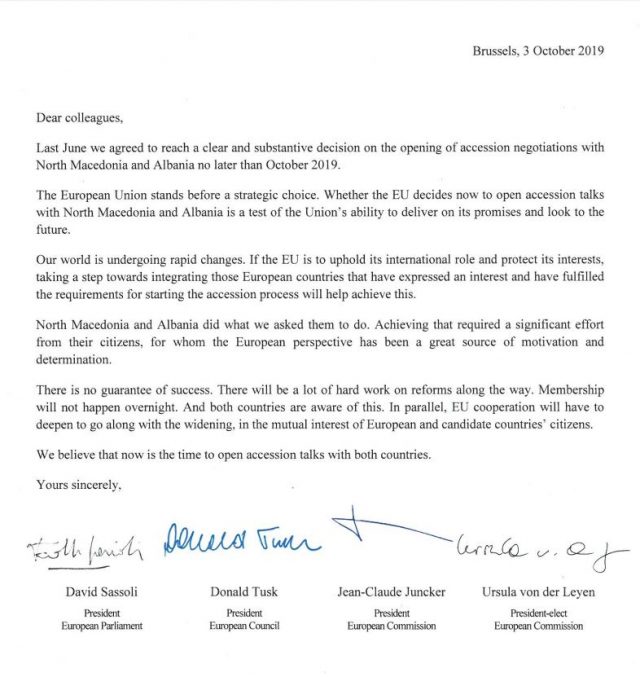 “Vendimi i BE-së për të hapur negociatat e anëtarësimit me Maqedoninë e Veriut dhe Shqipërinë është një test për aftësitë e Unionit për të mbajtur premtimet e tij dhe për të parë drejt së ardhmes”, thuhet në letër.