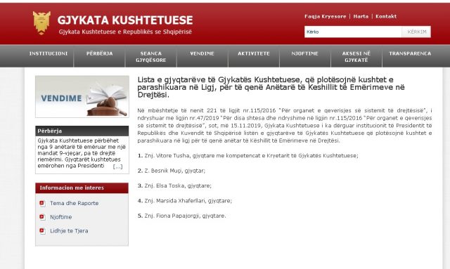 Në mbështetje të nenit 221 të ligjit nr.115/2016 “Për organet e qeverisjes së sistemit të drejtësisë”, i ndryshuar me ligjin nr.47/2019 “Për disa shtesa dhe ndryshime në ligjin nr.115/2016 “Për organet e qeverisjes së sistemit të drejtësisë”, sot, më 15.11.2019, Gjykata Kushtetuese i ka dërguar institucionit të Presidentit të Republikës dhe Kuvendit të Shqipërisë listën e gjyqtarëve të Gjykatës Kushtetuese që plotësojnë kushtet e parashikuara në ligj për të qenë anëtar të Këshillit të Emërimeve në Drejtësi.