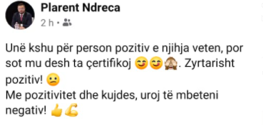 “Unë kështu për person pozitiv e njihja veten por sot m’u desh ta çertifikoj. Zyrtarisht pozitiv. Me pozitivitet dhe kujdes, uroj të mbeteni negative”, shkruan Ndreca./mv.abcnews.al