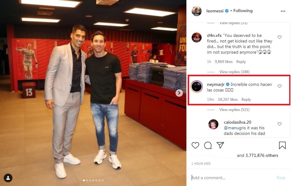 Leo Messi nuk është dakord me vendimin e Barcelonës për të larguar nga skuadra sulmuesin Luis Suarez, me të cilin ai ka edhe një raport shumë të mirë miqësor. Argjentinasi e pranon se nuk habitet nga ajo që drejtuesit kanë bërë, ndërkohë që një reagim në postimin e Messit e ka bërë edhe Neymar. Sulmuesi brazilian i PSG është mjaftuar me një koment të shkurtër: “E pabesueshme si i bëjnë gjërat”.