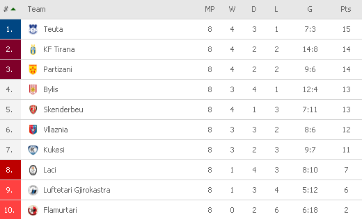 vendin e parë me vendin e gjashtë i ndajnë vetëm tre pikë. Teuta kryesuese është në kuotën e 15 pikëve, ndërsa Vllaznia e vendit të gjashtë ka 12 pikë. Kukësi në vendin e shtatë numër 11 pikë, ndërsa 3 vendet e fundit janë shkëputur disi.