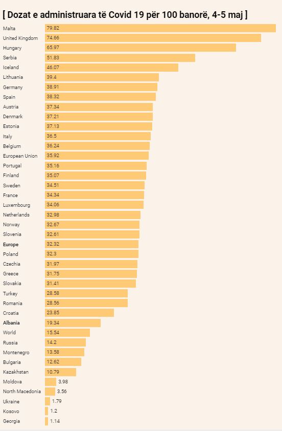 Sipas të dhënave të Worldindata, të përditësuara deri në datën 4-5 maj, në Shqipëri ishin dhënë 19.3 vaksina për 100 banorë, në krahasim me 32.3 që është mesatarja europiane dhe rreth 36, që është mesatarja e Bashkimit Europian dhe pak më lart se mesatarja globale prej 15.5.