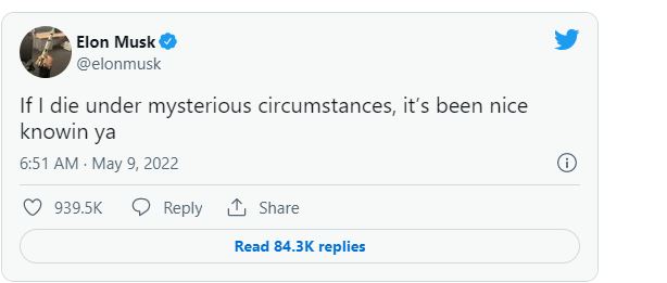 “Nëse unë vdes në rrethana misterioze, është kënaqësi që ju kam njohur,” shkroi Musk në Twitter, rreth një javë pasi ai njoftoi vendimin e tij për të blerë kompaninë e famshme.  Ai ka shkaktuar një sërë reagimesh nga ndjekësit. Ndërsa disa shprehën shqetësimin, shumë të tjerë mbështetën anën e tij qesharake.