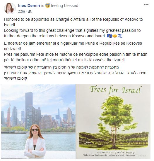 Pres me padurim këtë sfidë të madhe që nënkupton edhe pasionin tim të madh për të thelluar edhe më tej marrëdhëniet midis Kosovës dhe Izarelit“, shkruan Ines Demiri, vajza e Votim Demirit, kryetarit të Bashkësisë Hebreje të Kosovës.