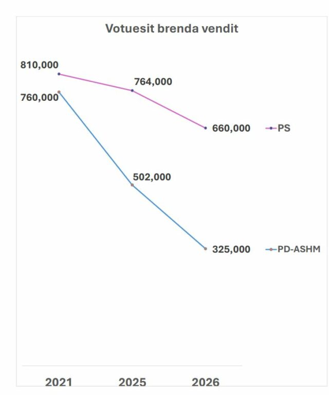 Ndërsa për PS-në votuan rreth 810 mijë – një epërsi socialiste brenda vendit prej rreth 50 mijë votuesish ndaj PDASHM. Duke përmbledhur, PD-ASHM ka sot rreth 435 mijë votues më pak brenda vendit se sa më 2021. Ndërsa PS ka vetëm 150 mijë më pak. Si rezultat, epërsia e PS-së është rritur nga rreth 50 mijë brenda vendit më 2021, në rreth 335 mijë sot.
