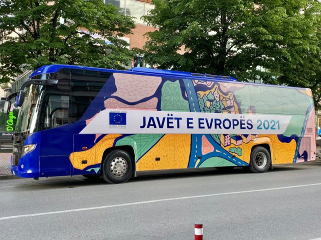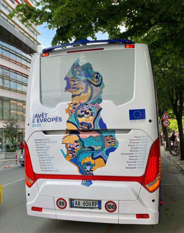 “Evropa është këtu! Ne do të jemi në rrugë për tre javë, duke ndaluar çdo ditë në një bashki, shumica e tyre ku nuk kemi qenë kurrë. Ju do të dalloni autobusin tonë duke shëtitur përreth! #TeamEurope do t’ju arrijë atje ku jeni.