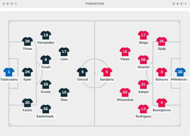 Tekniku italian i “djajve”, Stefano Pioli ka habitur paksa me formacionin, teksa ka zgjedhur për këtë sfidë, modulin 3-4-2-1, ku në portë është vendosur i “preferuari” i teknikut, rumuni Tatarusanu. Në mbrojtje Kalulu, Kjaer dhe Thiaë, ndërsa në mesfushë Saelemaekers, Krunic, Tonali dhe Hernandez. Ndërkaq, fronti i sulmit i është bësuar treshes, Brahim Diaz, Rafael Leao dhe Olivier Giroud.