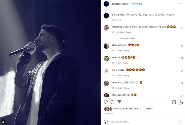‘Makina me targa AA… ka bllokuar rrugën’, ka shkruar Donaldi. Kaq ka mjaftuar që ndjekësit të vërshojnë me komente. “Bora Zemani liroje rrugën zemër se po kalon Donald Veshaj”, “Poshtë një pallati”, “Makina me targa AA 9 janar ka bllokuar rrugën”, “Makina e Borës”, kanë komentuar ndjekësit.