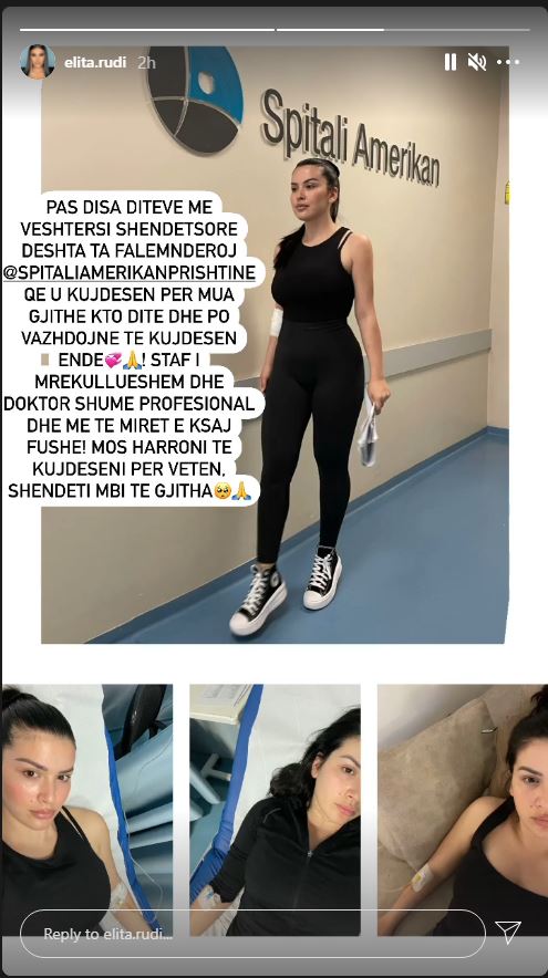 Elita ka publikuar disa foto të saj, në të cilat shihet e shtrirë në një krevat spitali duke marrë serum. Ajo ka treguar e ka pasur për disa ditë me radhë vështirësi shëndetësore dhe ka falenderuar stafin e mjekëve që është kujdesur për të në këto momente vështira.