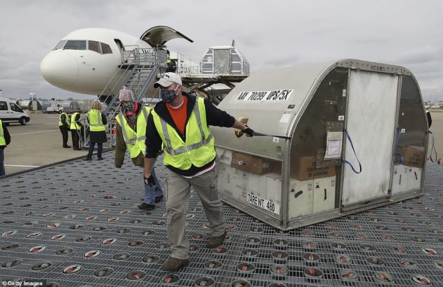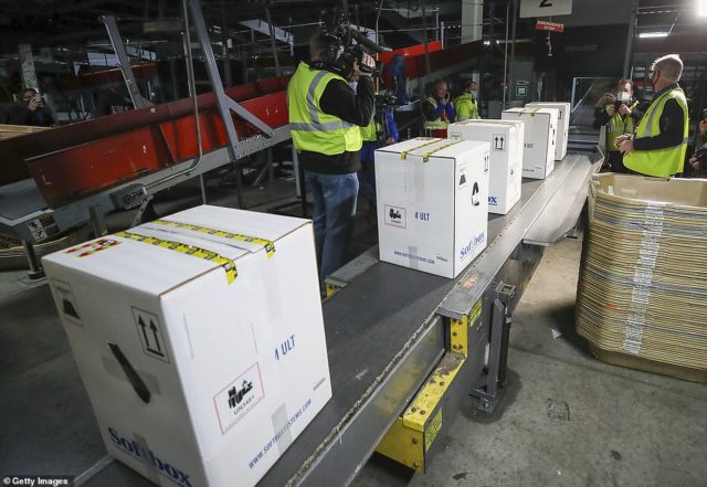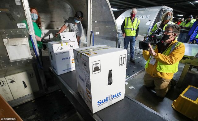 Në disa foto të publikuara në media, punonjësit shihen ndërsa shkarkojnë kutitë e vaksinave nga një aeroplan në një qendër logjistike të UPS në Louisville, Kentucky, të dielën në mbrëmje nën mbikëqyrjen e Presidentit të Shëndetësisë UPS Wes Wheeler. s.b/abcnews.al/