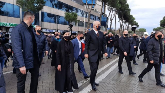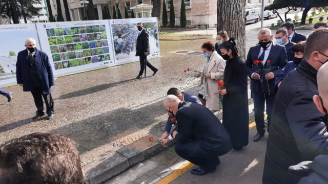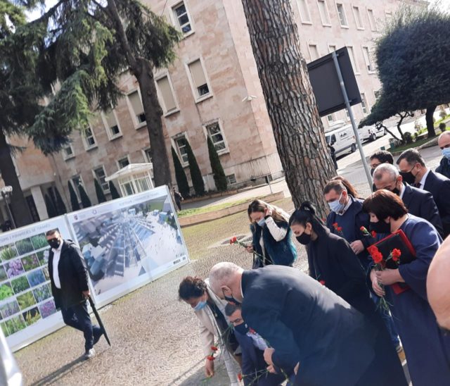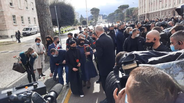 Duke ecur krah tyre Rama doli nga kryeministria me trëndafila në duar i shoqëruar edhe nga vajza e njërit prej katër të vrarëve Ziver Veizit, Ana Veizi.