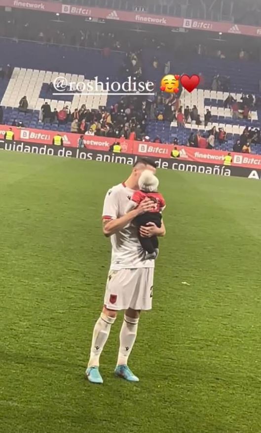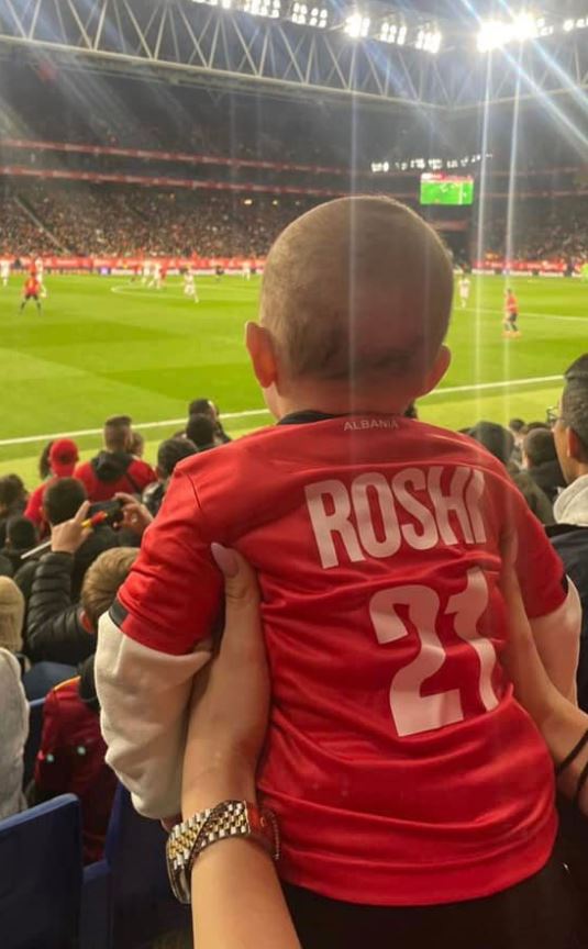 Bëhet fjalë për djalin e Odise Roshit, Roisi në krahët e të ëmës shikonte të atin teksa luante në fushën e lojës, sigurisht tifozi i vogël kishte të veshur edhe trikon e kombëtares me emrin dhe numrin e të atit të tij.