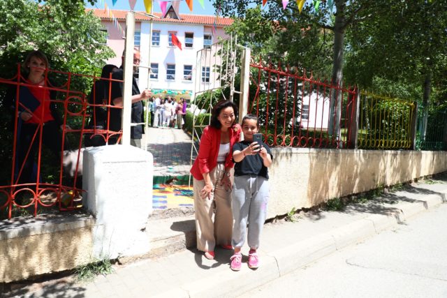 Kim ka takuar fëmijë të këtij kopshti dhe pjesëtarë të personelit. Më herët ambasadorja u ndal në ambientet e Bashkisë Kukës ku u takua me kryebashkiakun Safet Gjici dhe pa nga afër sheshin ku u pritën shqiptarët e Kosovës në periudhën e luftës. /mv.abcnews.al