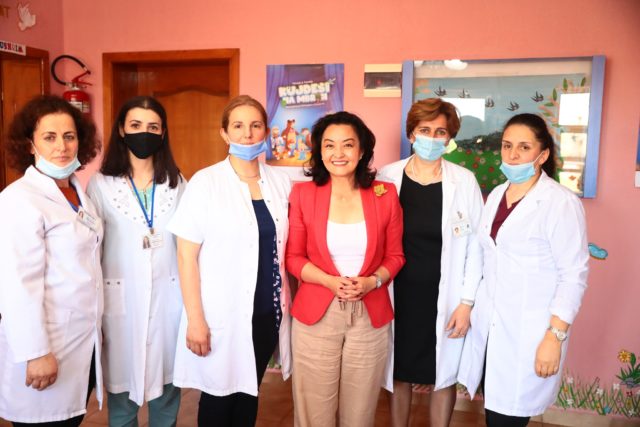 “Ambasadorja Kim vizitoi kopshtin Nr. 1 në Kukës sot, njëri nga disa prej kopshteve që po përdorin paketat e higjenës të shpërndara në kuadër të fushatës parandaluese për COVID19 të UNICEF, për të cilën qeveria e Shteteve të Bashkuara kontribuoi me 1.4 milionë dollarë në mbështetje të përgjigjes për COVID-19 në Shqipëri.