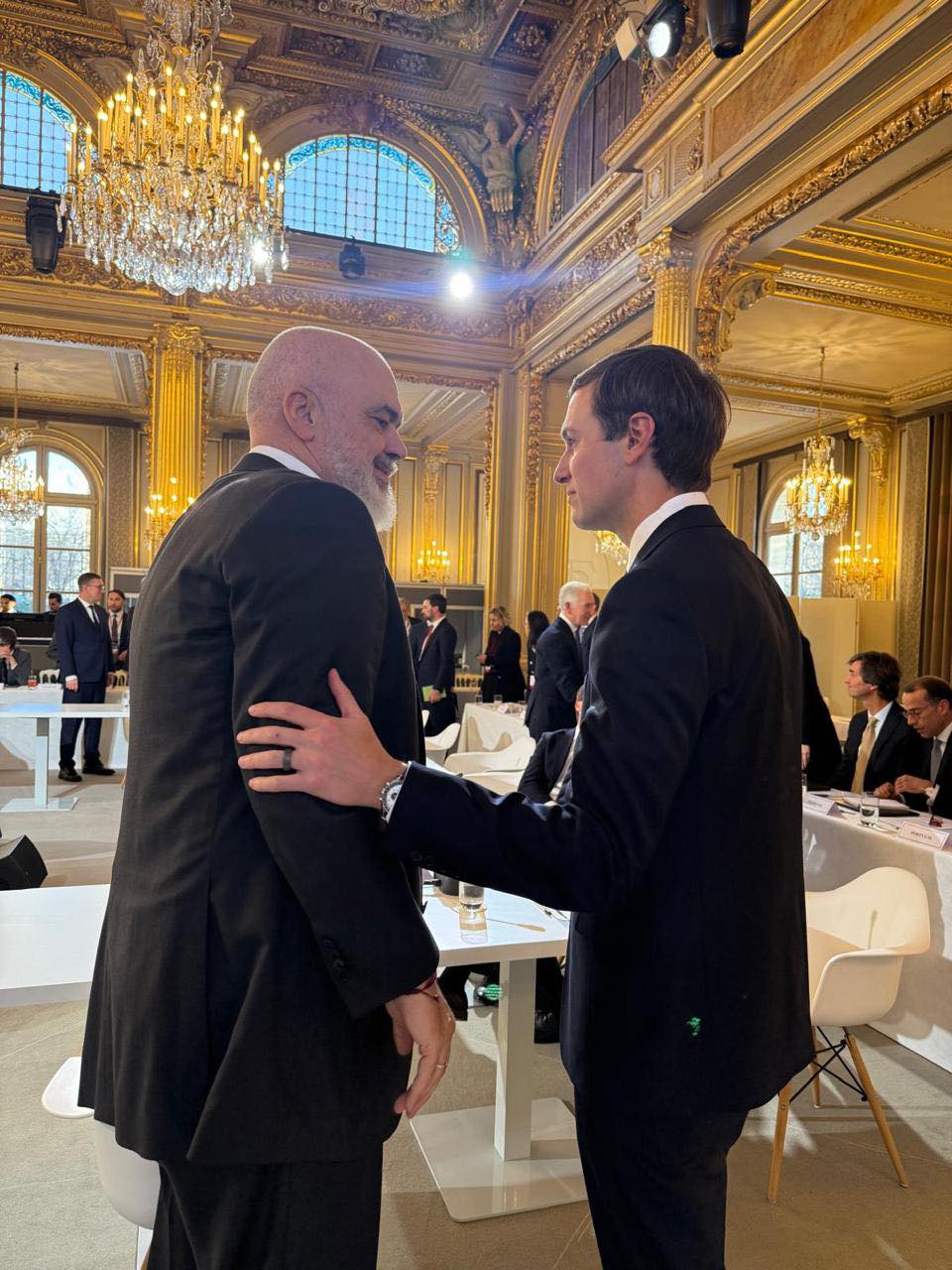 Rama shkëmbeu një shtrëngim duarsh dhe përqafim miqësor me dhëndrin e Trump, Jared Kushner, në Paris.