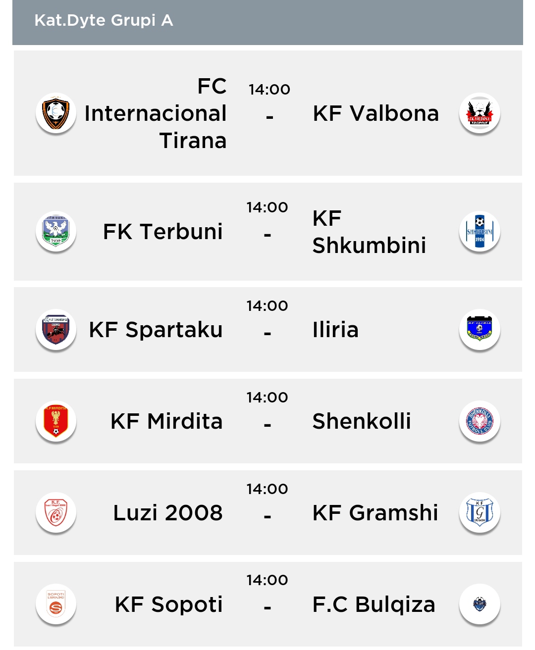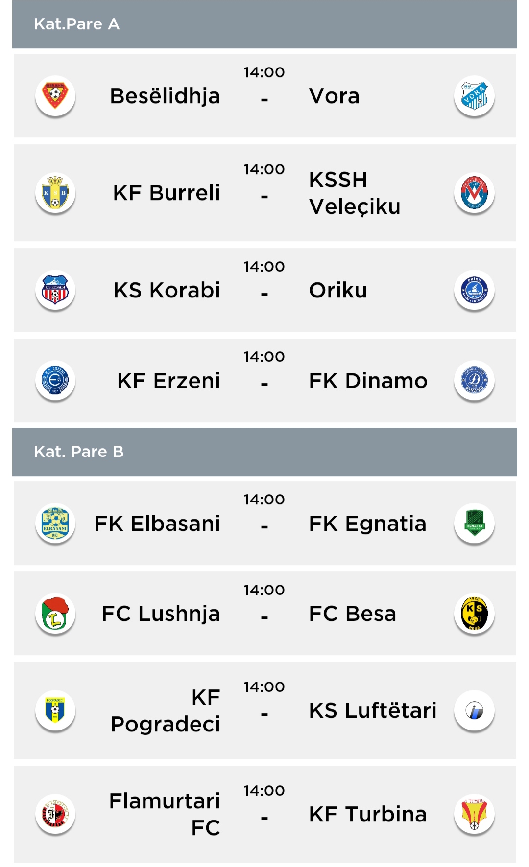 Kategoria e Parë luhet në orar ndryshe. Ndeshjet nisin prej orës 14:00. Në grupin A Erzeni-Dinamo është sfida që spikat, ndërkohë Burreli e Besëlidhja do kërkojnë që sot të tregojnë se janë gjithashtu ekipe pretendente për t’u ngjitur.