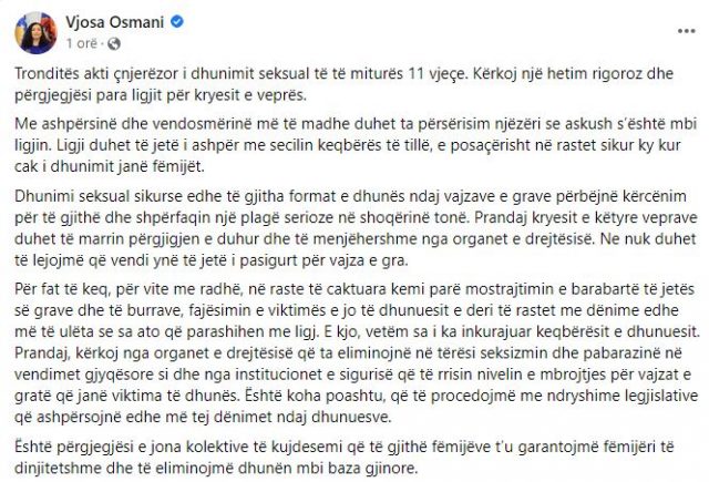 Presidentja e Kosovës, Vjosa Osmani, në një postim në Facebook lidhur me këtë rast thotë se e mitura ishte 11-vjeçare.