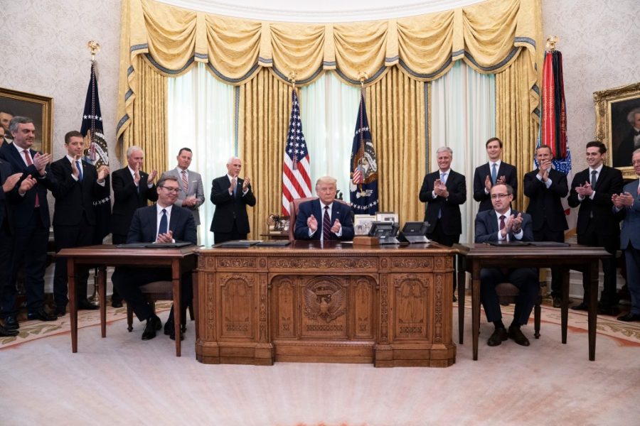 “Duke u fokusuar në krijimin e vendeve të punës dhe rritjen ekonomike, të dy vendet ishin në gjendje të arrinin një përparim të madh”, tha Trump në ceremoninë zyrtare në Zyrën Ovale në atë kohë, në prani të anëtarëve të kabinetit të tij, presidentit serb Vuçiq dhe të Kryeministrit të Kosovës Avdullah Hoti.