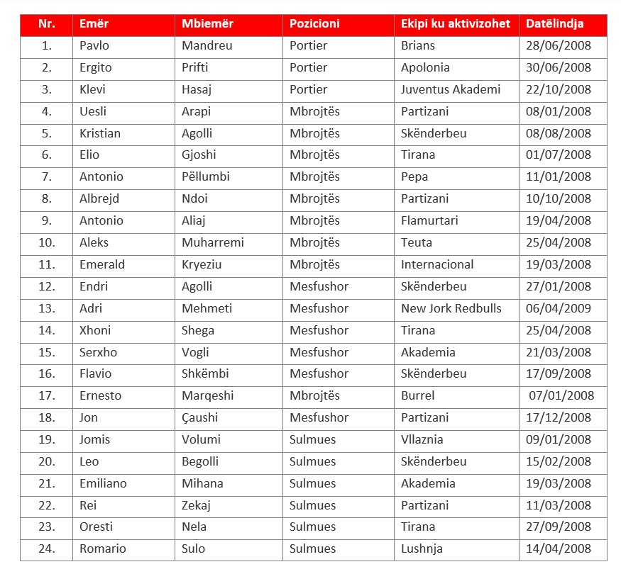 Më poshtë, edhe lista me emrat e 24 lojtarëve të ftuar në këtë seancë stërvitore të Kombëtares U-15: