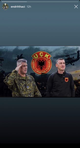 Ndërsa, së fundmi të njëjtën gjë ka bërë edhe djali i tij Endrit Thaçi. Në llogarinë e tij në Instagram, Endriti ka publikuar një fotografi të babait të tij të veshur me uniformën e ushtrisë dhe përkrah tij Kadri Veseli, gjithmonë duke vënë theks te UÇK- ja.