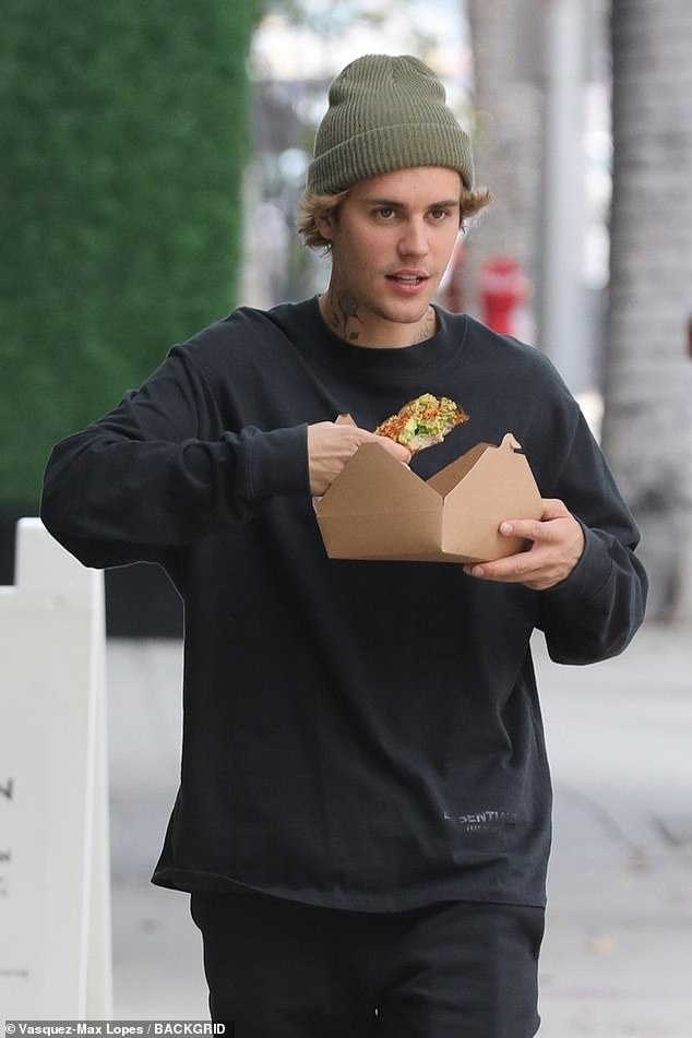 Justin ishte i veshur me një veshje sportive ‘slob-rity’, duke përfshirë një këmishë të zezë me mëngë të gjata, tuta dhe atlete dhe një kapele ngjyrë ulliri, shkruan DailyMail